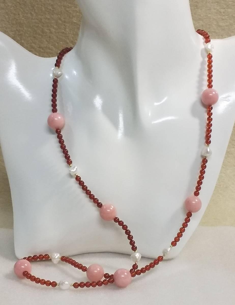 - ★最終8割引 天然石 ロングネックレス オパールΦ12mm×9個/小粒パール/茶アゲートなど 68cm★ABN7985-65