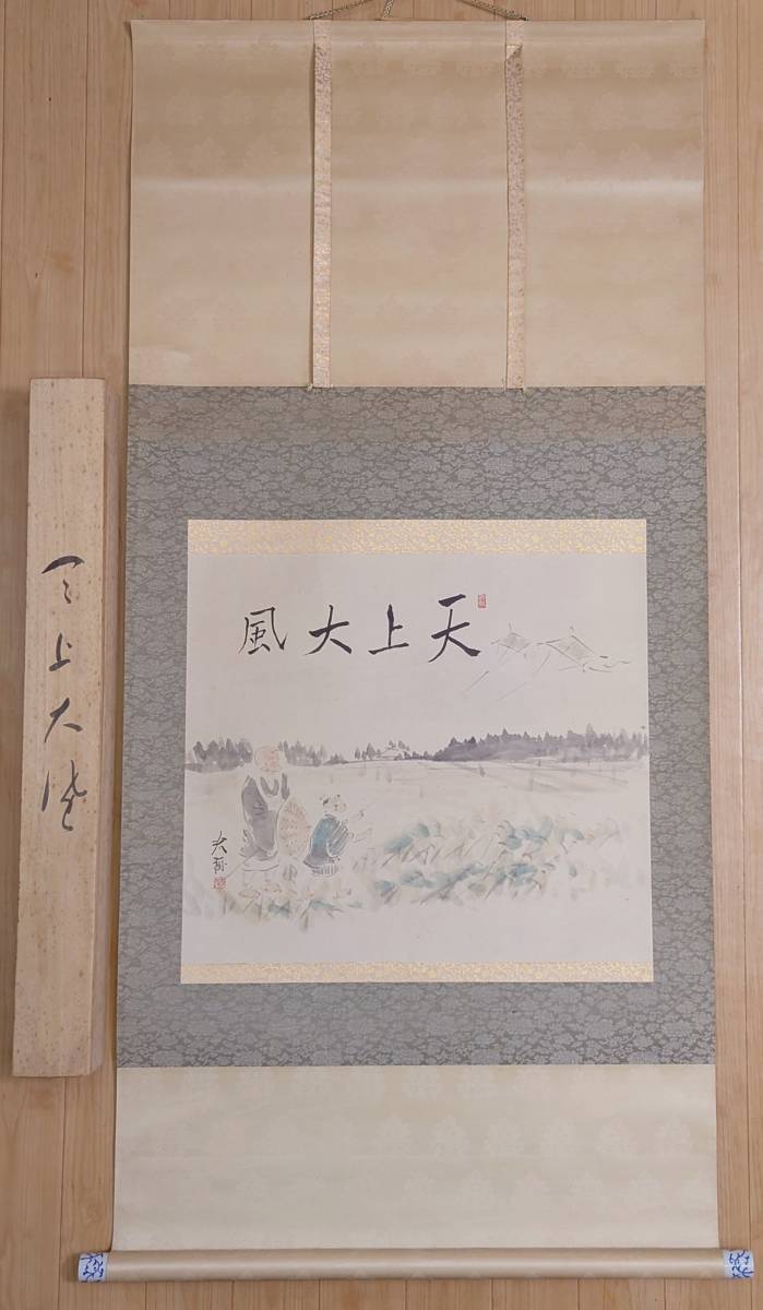 > ◆真筆保証品◆人気! 良寛さまを描く!! 【 天上大風 】◆ 良寛様と童子の凧上げ図天上大風書賛画 掛軸 茶掛 : 影丘治彌 画伯作 ◆ 共箱付き