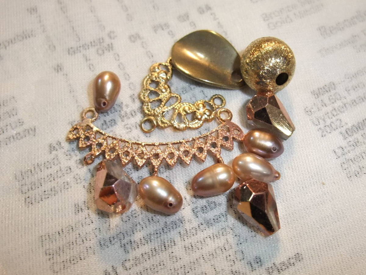 - 513-7ベージュ系クレオパトラ真珠と真鍮パーツチェコガラスセット☆古い手持ちの真鍮素材のパーツや旧チェコスロバキア製のグラスビーズ