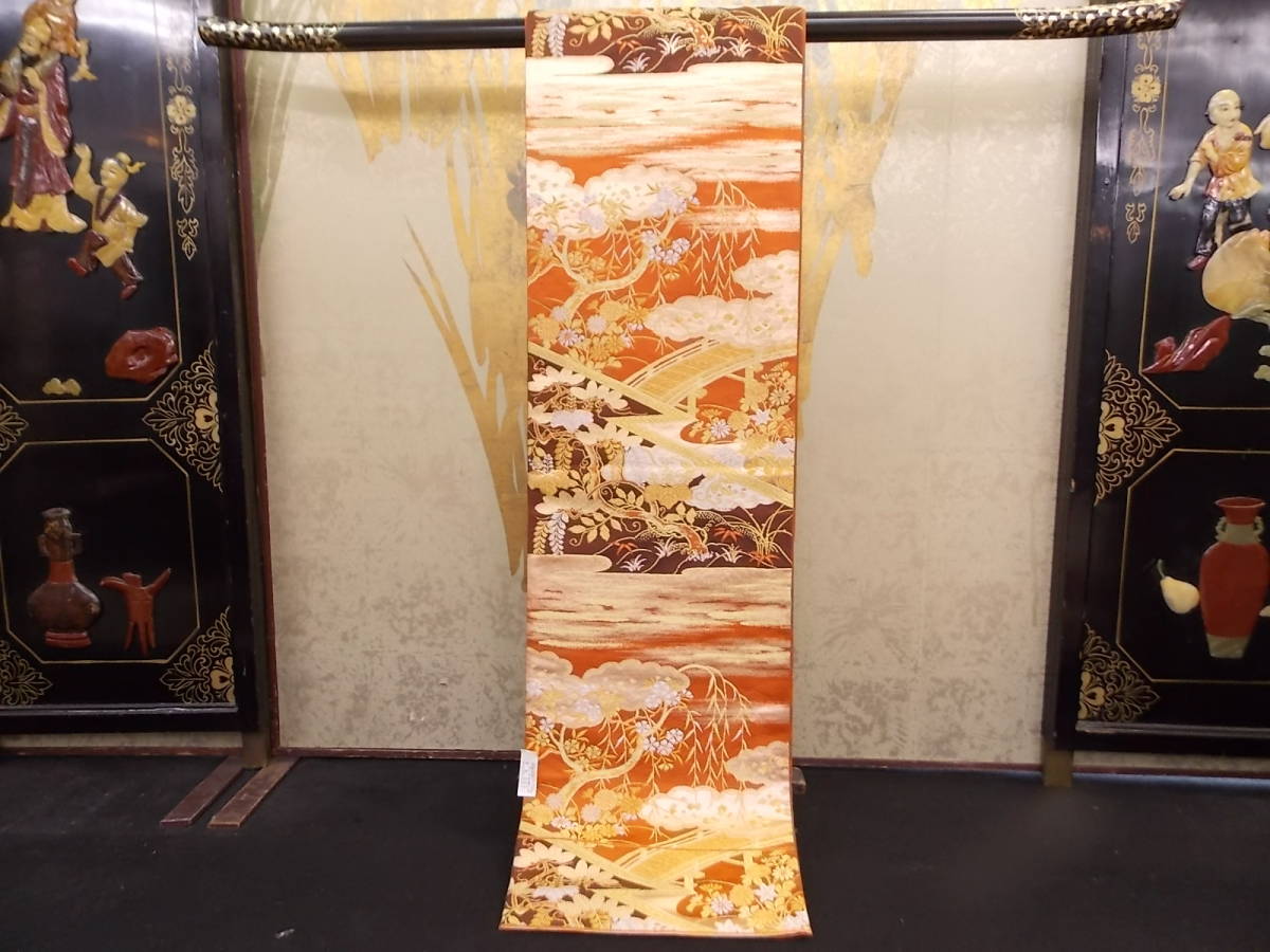 > きもの今昔3163 袋帯 西陣織錦織煉瓦色地 しだれ桜に太鼓橋などの情緒風景