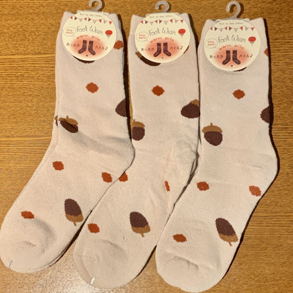 - 【新品】送料無料 あったか靴下 3点セット どんぐり柄 パイル地 ソックス フリーサイズ レディース22~24cm アイボリー 保温 防寒 CR_P1①