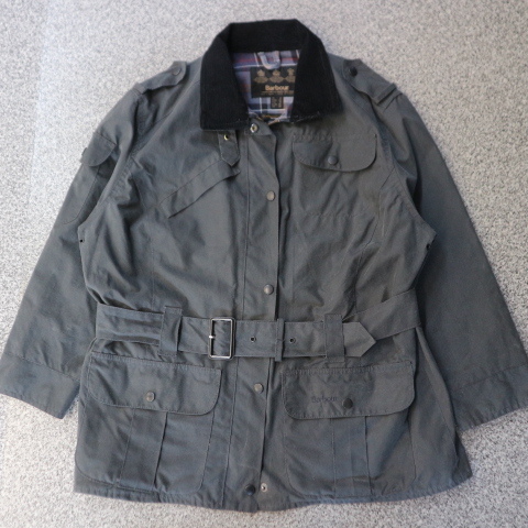 > Barbour FLYWEIGHT WAX AMELIA オイルド ジャケット UK18 グレー バブアー アメリア 襟コーデュロイ チェック柄ライナー ベルト付き