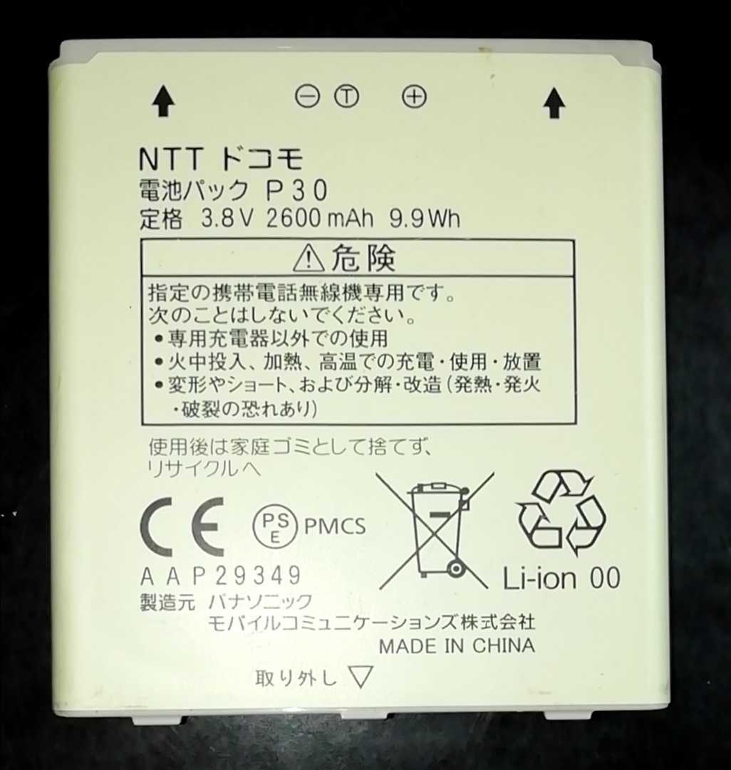 - 【中古・残り1個】NTTドコモP30純正電池パックバッテリー【充電確認済】対応機種(参考)P-03E