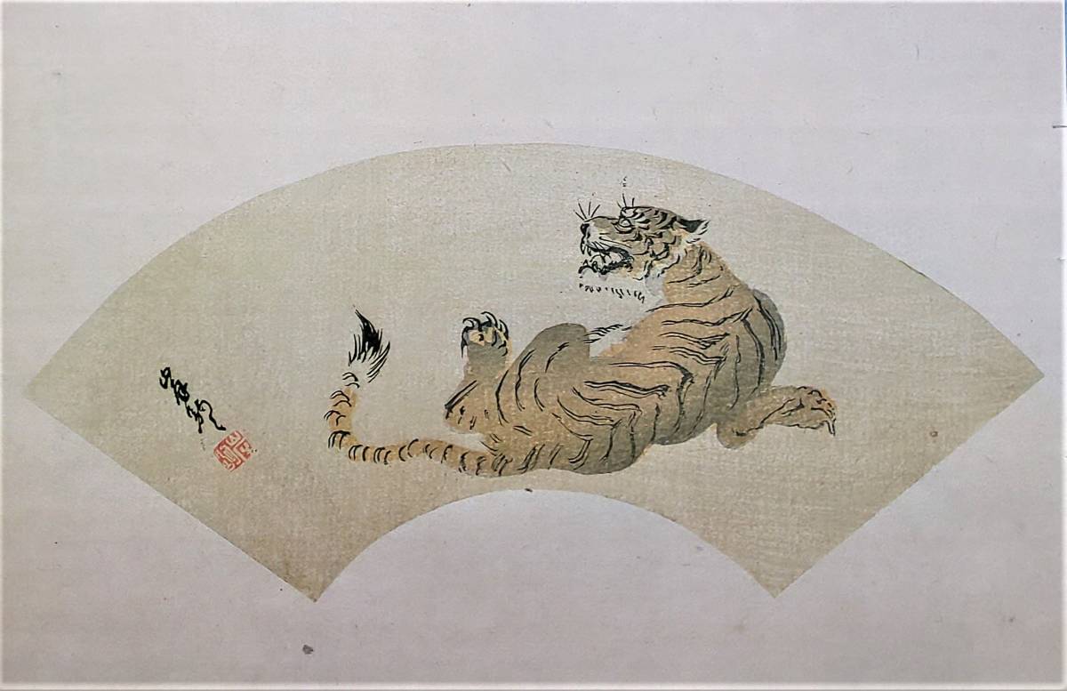 - 岸駒 本摺り版画 埋もれた版画扇面画46「猛虎図」本物版画「名家百選画譜」明治29年青木嵩山堂