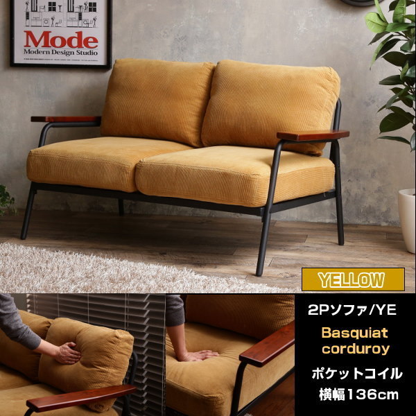 - 送料無料 北欧スタイル コーデュロイ 2人掛けソファ 横幅136cm ポケットコイル仕様 洗濯できるカバーリング イエローYE