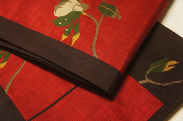 > 特選『木屋太』焦げ茶色紅樺色縦縞花模様未着用袋帯O12057