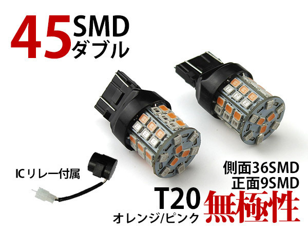 - ◆セール◆無極性 一球二色 T20/7443 45連SMD(24+21) LEDダブル球 橙/ピンク リレー付 2個