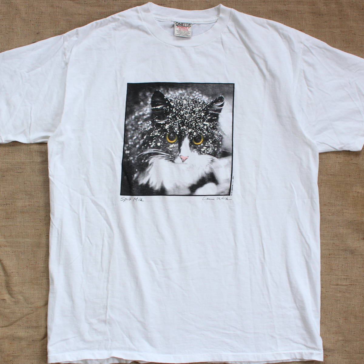 > 新品 レア 1993年 ネコ 猫 キャット Cat ヴィンテージTシャツ Spilt MilkアメリカUSA フォト ONEITAホワイト ミルク アート 古着XLかわいい