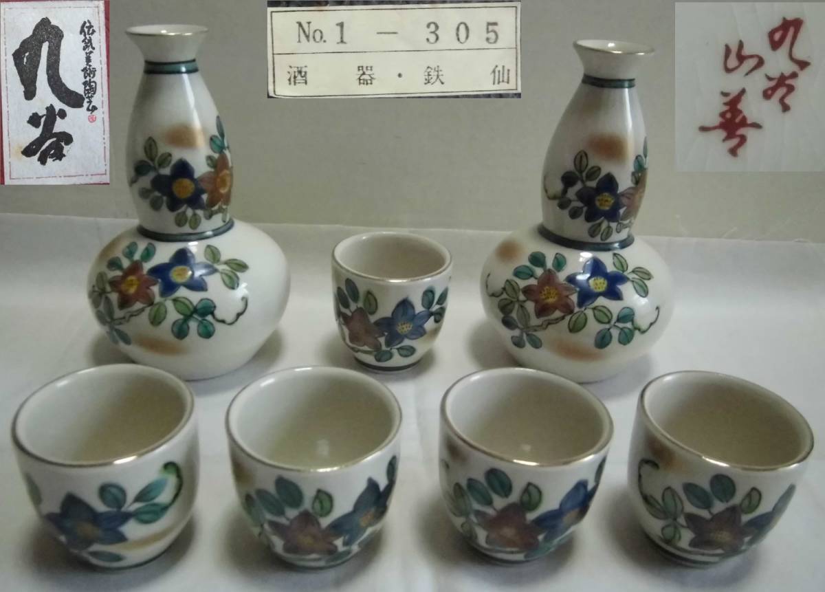 > 九谷焼 徳利 2本 お猪口 5客 伝統美術陶芸 山善 鉄仙柄 計7点 ひょうたん形 酒器揃 色絵 金彩 ぐい呑み 盃 杯 陶器 レトロ アンティーク