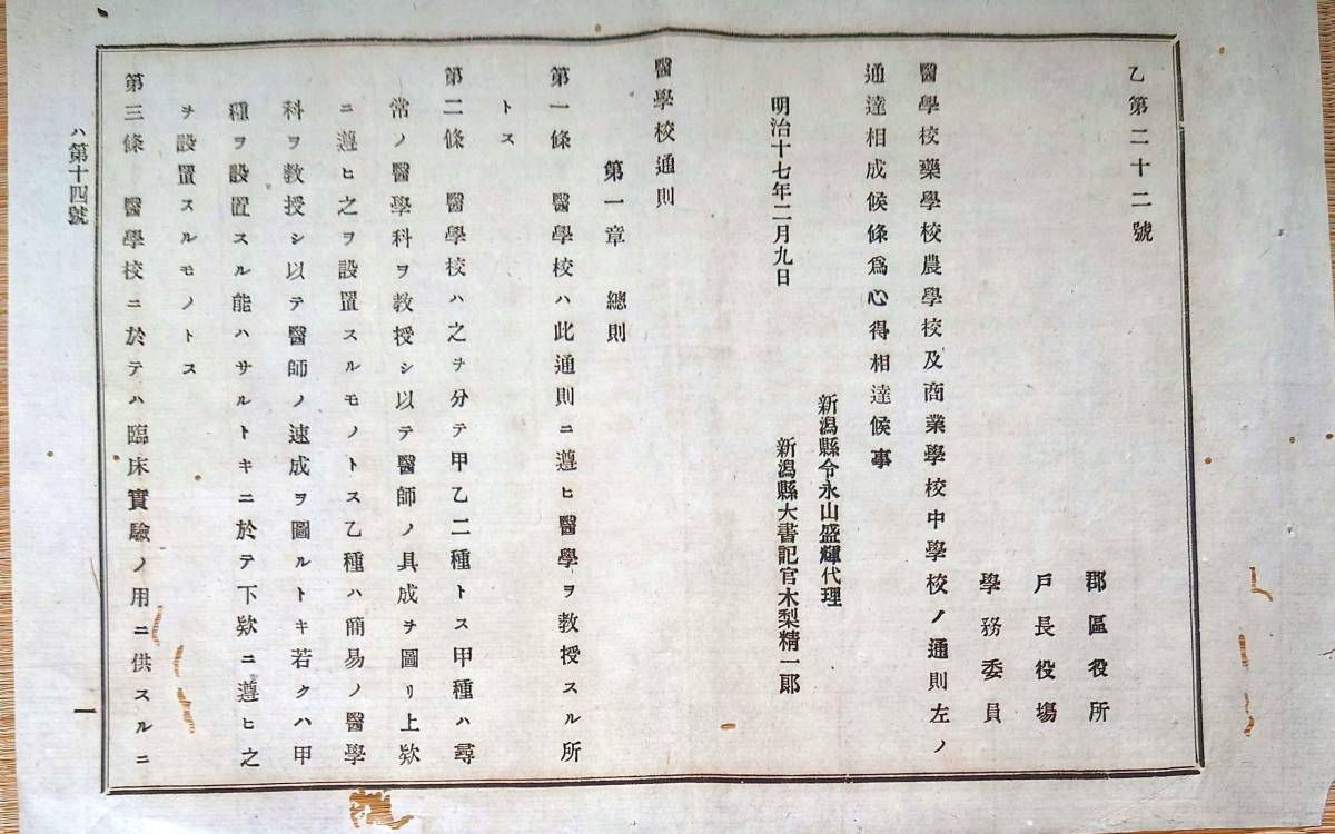 - f22060101〇明治布告布達 医学校 薬学校 農学校 商業学校 中学校の通則 18丁 明治17年 新潟県〇和本古書古文書