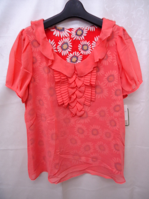 > 【KCM】kof-170★新品★【h bis/アッシュビス】プリント シフォン 重ね着風ブラウス サーモンピンク系 サイズ 40 レディース