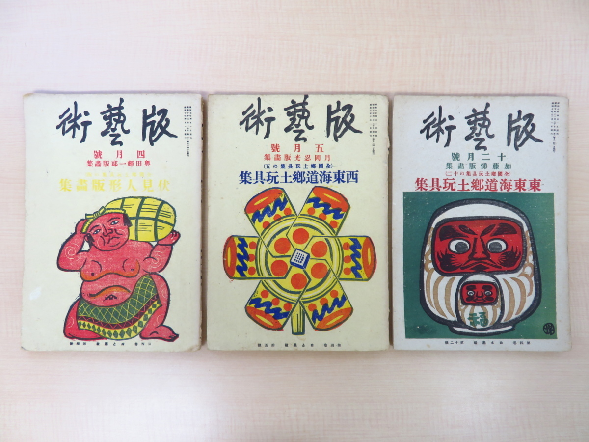 > 料治熊太編『版藝術』(3冊セット)昭和10年白と黒社 郷土玩具特集号 奥田輝一・月岡忍光・加藤悌の彩色木版画約60図入 伏見人形ほか
