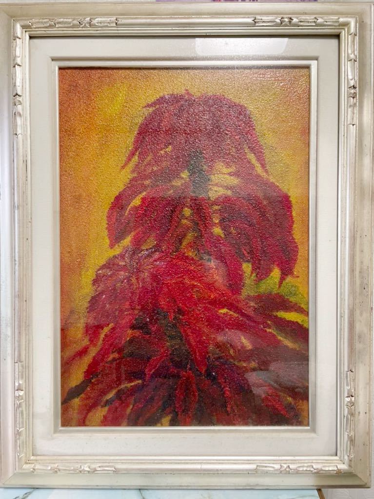- 【真作】葉鶏頭ハゲイドウ 赤 滝沢 敏 油彩 植物 花 サイズ額有88×69cm 赤く燃える葉鶏頭の絵 リビングの彩り日本画 目も覚める情熱の赤