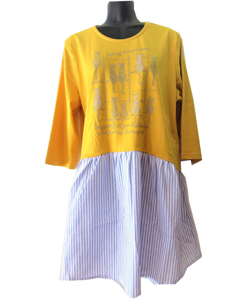 - レディースファッション トップス チュニック 春夏モデル ラインストーン猫 Aラインチュニック7分袖 サービス品 イエロー ka4530i