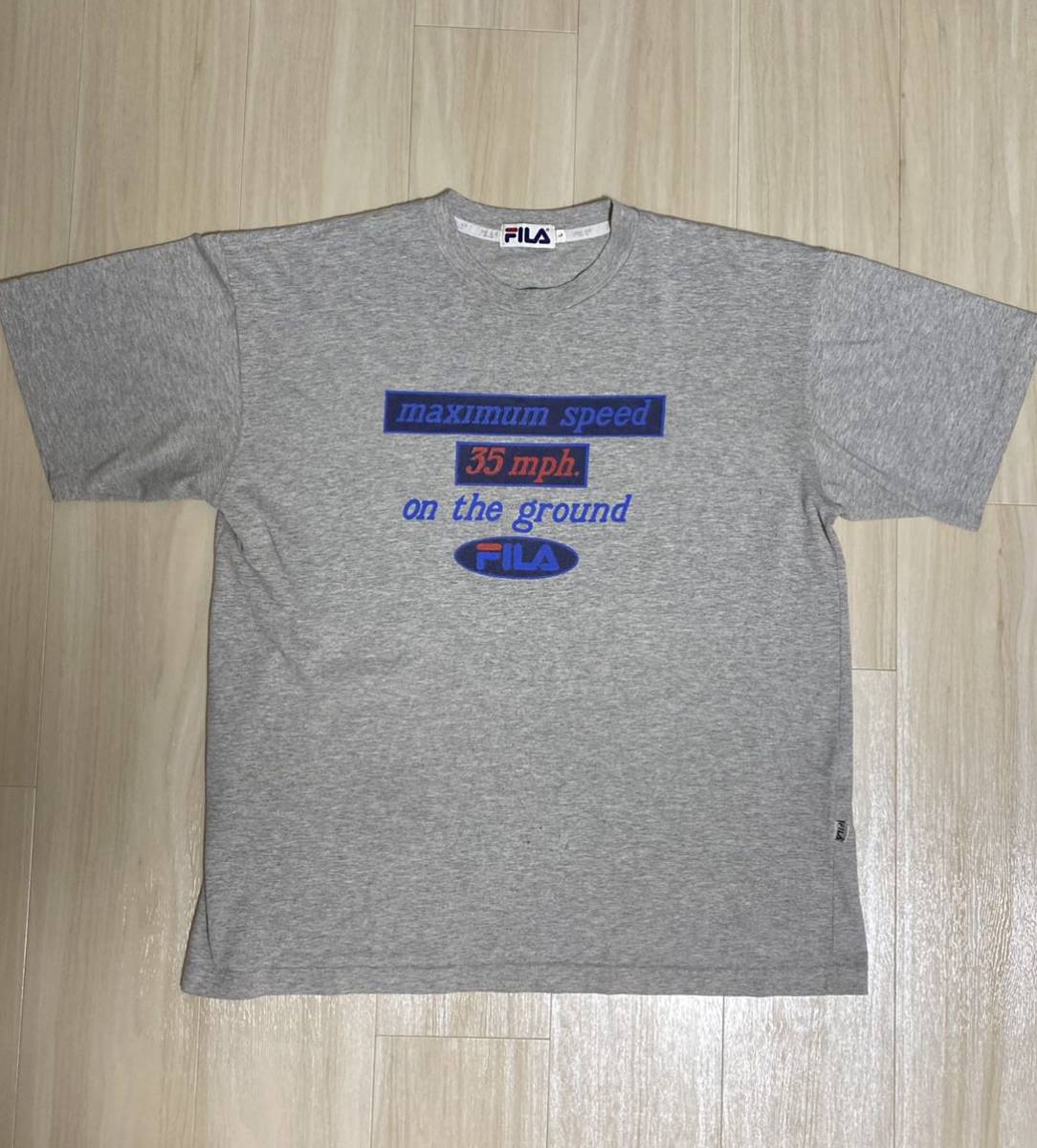 > FILA(フィラ)プリントTシャツ■Lサイズ■バックプリント有ロゴグレーアメカジスポーツブランドメンズ古着