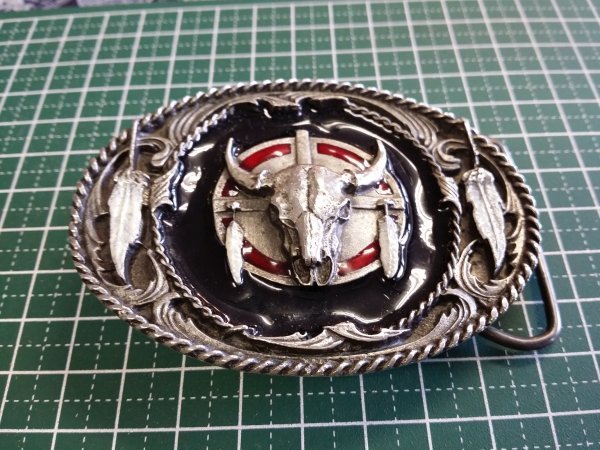- バックル バッファロー 牛 骨 骸骨 ネイティブ インディアン フェザー 羽 ヴィンテージ ベルト 非鉄 真鍮 ブラス