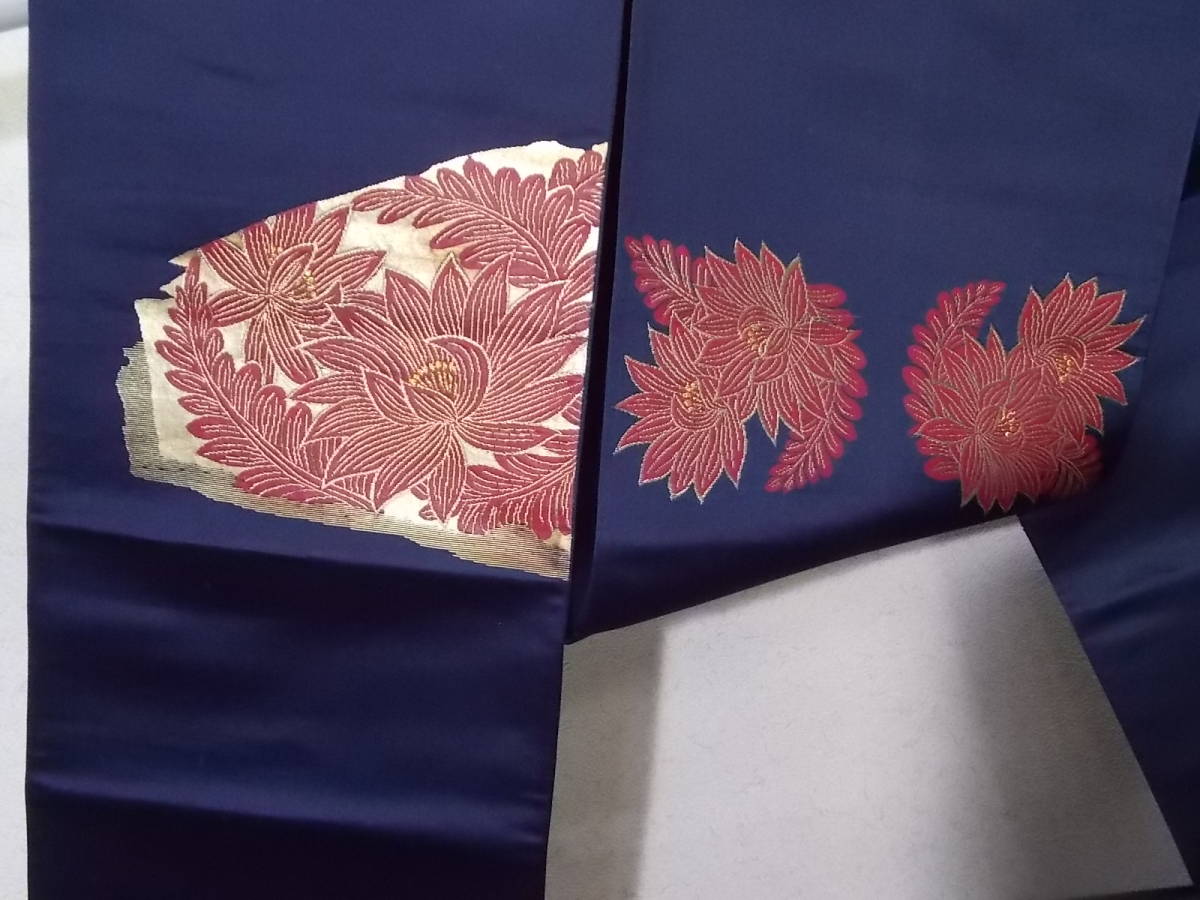 > きもの今昔3994 夏の100円バーゲン 名古屋帯 太鼓と前腹に柄 繻子緞子地 紺色にレンガ色花柄 開き仕立て総裏