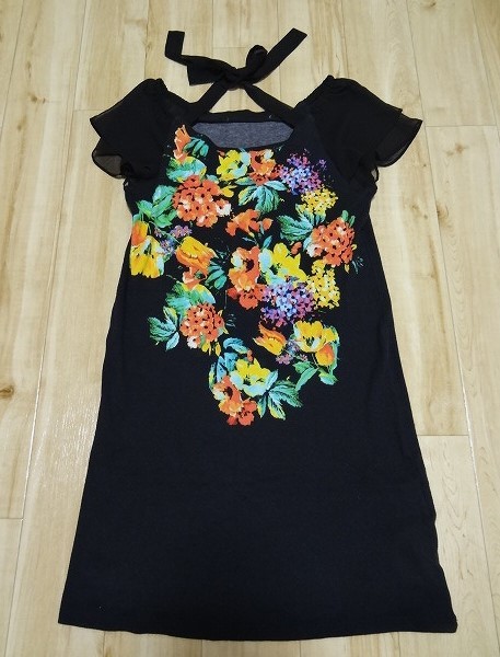 > aquagirl ON THE STREET アクアガール オンザストリート 半袖 ブラック 花柄 カットソー ◆ フレアスリーブ バックリボン 黒 38 ◆ USED