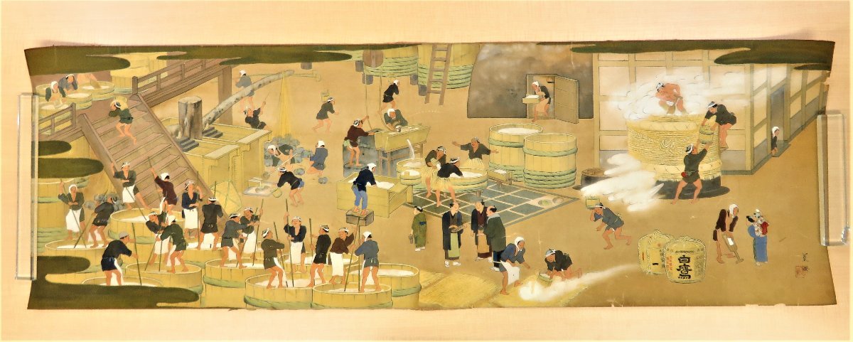 - 本田蕉風 肉筆画巻「白鷹 酒造図」(真作保証品)明治時代末~大正時代頃 兵庫県の日本画家による灘の銘酒「白鷹」醸造風景図 日本酒