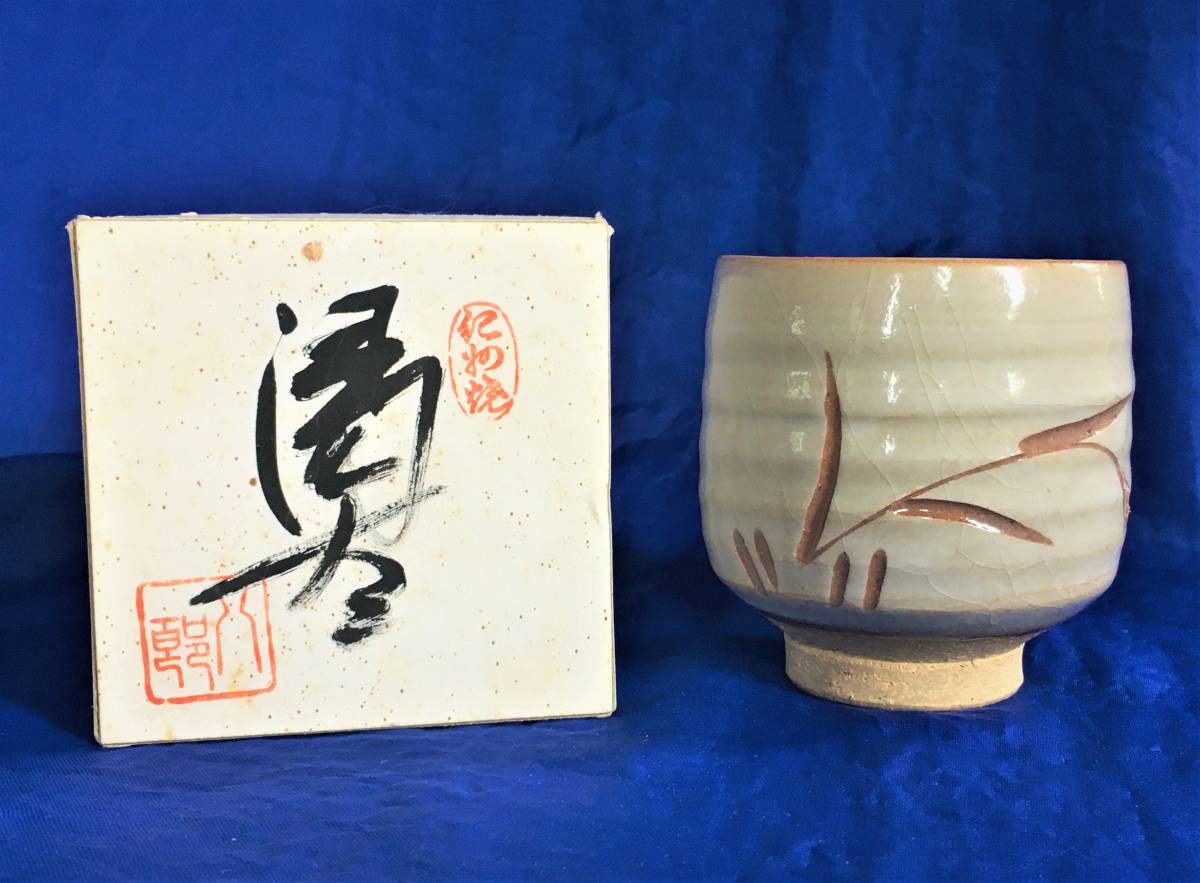> 【未使用・自宅保管品】紀州焼 黒潮窯 寒川八郎 素朴なススキ柄 湯呑 湯のみ 箱&リーフレット付き 焼き物 食器 陶器 美品