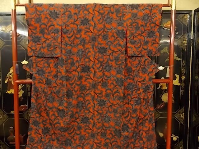 - きもの今昔4222 小紋のきもの 正絹駒上代生地 朱赤地の唐草模様 胴裏緋色 身丈150cm