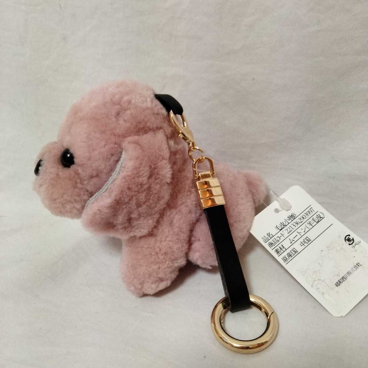 - リアルラム キーホルダー ムートン 羊毛皮 犬 ドッグ ぬいぐるみ ピンク系 高さ9cm 220917