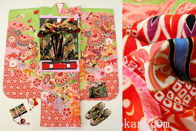 - 【進興館】新作 七五三 正絹 7歳用 女の子 高級 振袖 着物フルセット◆黄緑色系 しぼり柄 鞠◆sdyuri030