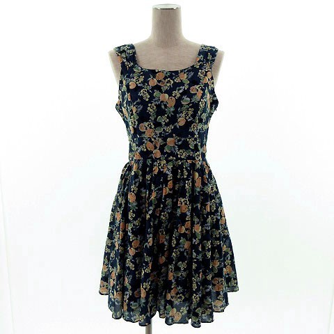 > ローリーズファーム LOWRYS FARM ワンピース ひざ丈 ノースリーブ フルーツ柄 ネイビー 紺 マルチカラー M レディース