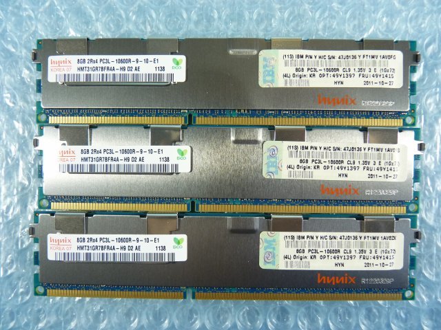 > 1MON // 8GB 3枚セット 計24GB DDR3-1333 PC3L-10600R Registered RDIMM 2Rx4 HMT31GR7BFR4A-H9 49Y1415 47J0136 // IBM x3755 M3 取外