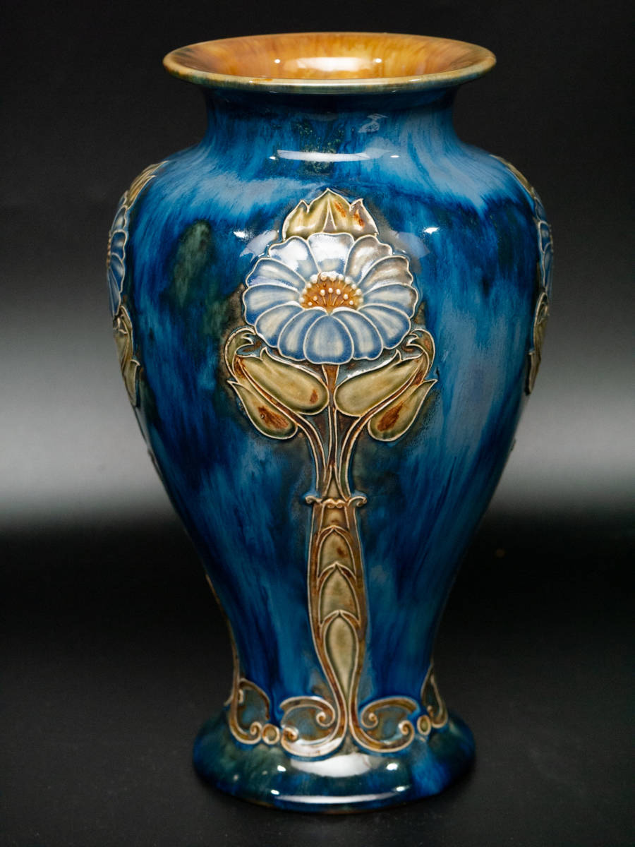 - 【値下げ交渉有り】 アンティーク アーツ&クラフツ ロイヤルドルトン 塩釉 陽刻 草花文 ベース 花入 花瓶