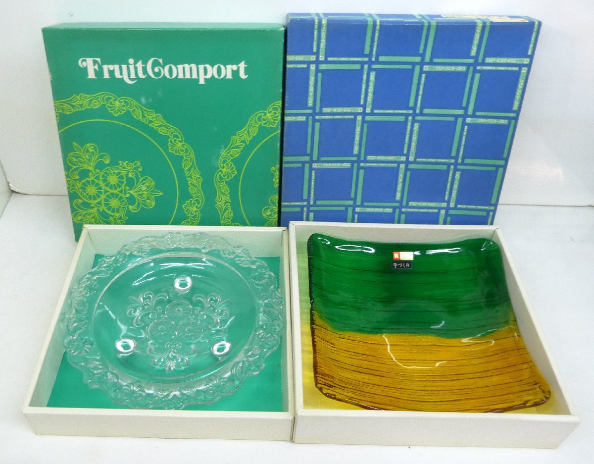 > ☆保管品!東洋ガラス【ローヌ フルーツコンポート】KURATAクラフトガラス【スクエアガラスプレート T-275】2点セット 箱付き☆