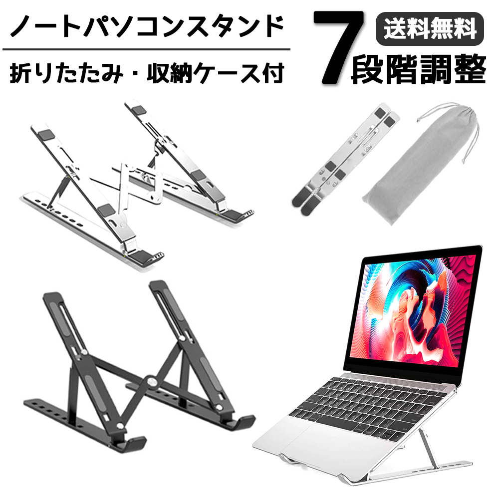 - ノートパソコンスタンド PCスタンド 折りたたみ アルミ合金製 軽量 コンパクト 高さ 角度調整 持ち運び 7段階 姿勢改善 タブレット 冷却