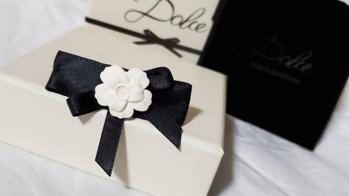 > 正規レア DOLCE&GABBANAドルチェ&ガッバーナ ヘアクリップ 1Pフラワー カメリアリボン バレッタ 黒×白 髪留め 髪飾り バロック D&G 付属有