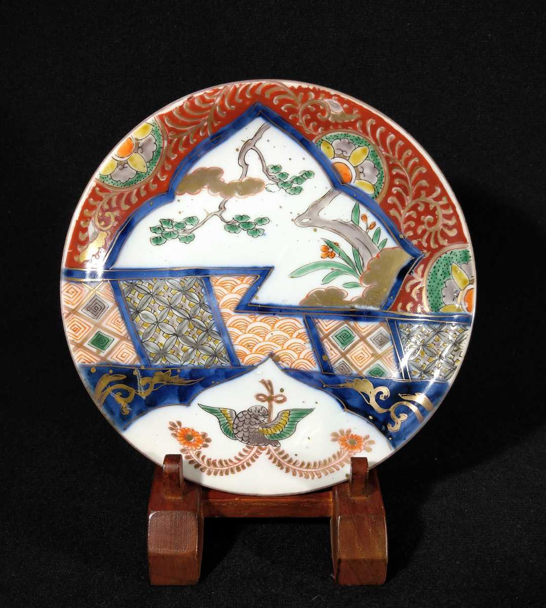 - 九谷焼 染付 金彩 色絵 花唐草文 富貴長春 松に鳳凰図 16cm 平皿 a-24b1398