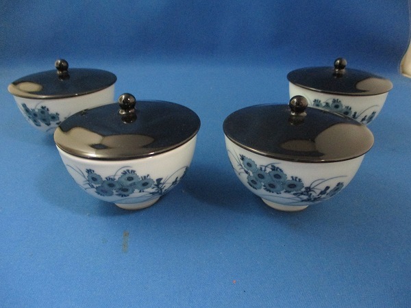 > ★蓋つき湯飲み 4個 陶器 花の絵柄 径8㎝ 高さ4.5㎝(湯飲みのみ)少々汚れあり tm2301-4-2★