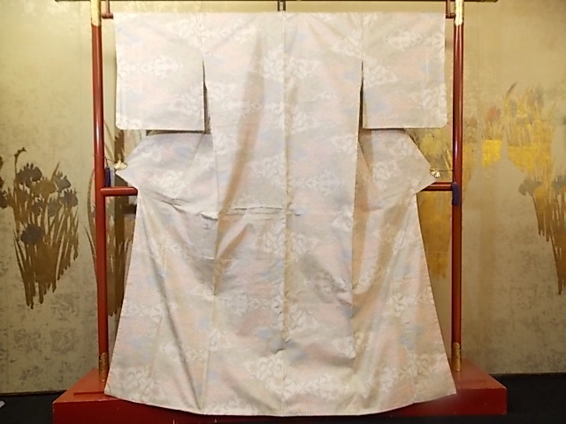 > きもの今昔4732 本場大島紬 白大島広衿袷仕立てきもの 7マルキ絣 唐花に扇柄 室系と付き未使用品 身丈162cm