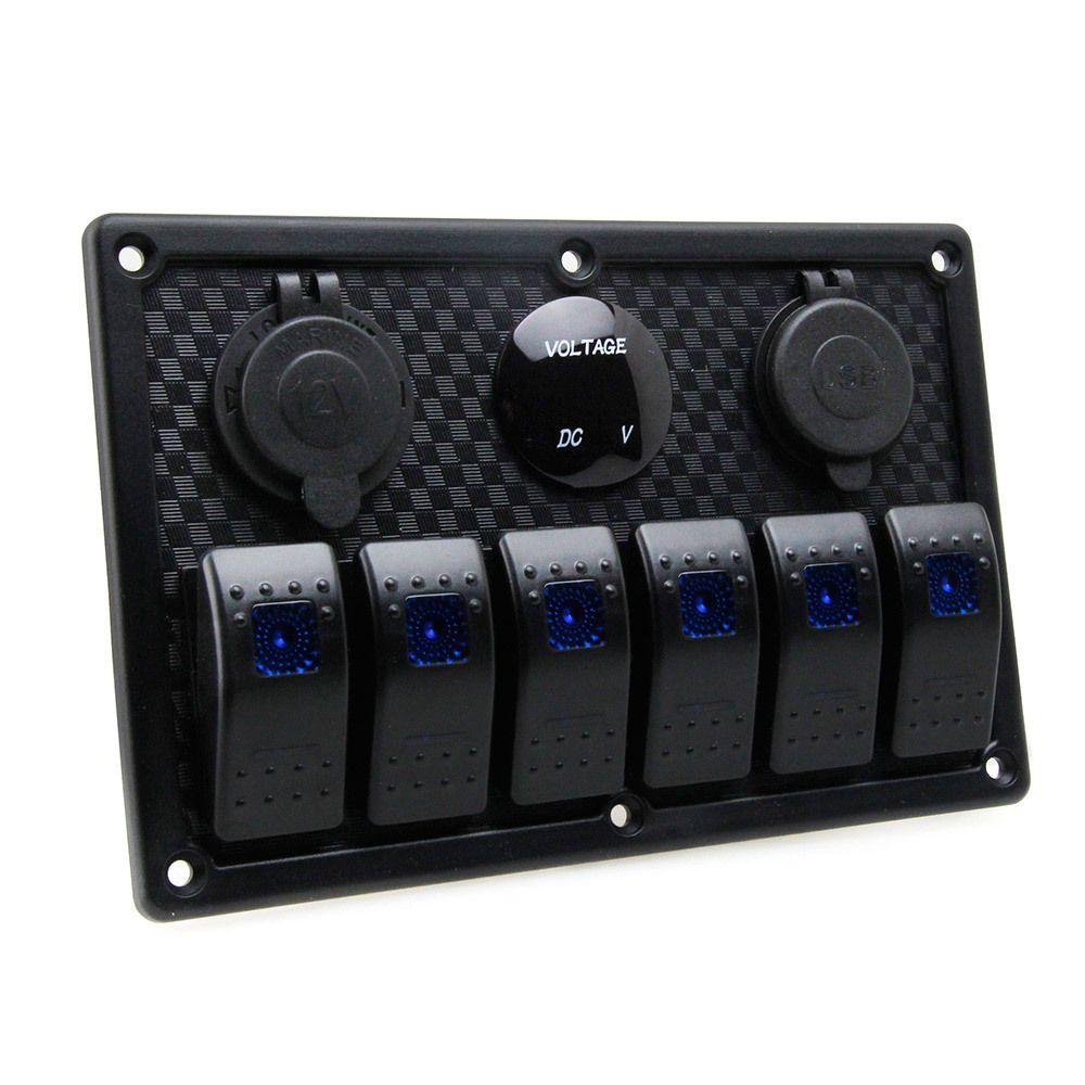 - QC3.0急速充電USB+青LED電圧計+シガーソケット+LED表示6連スイッチ 埋め型4in1増設ポート 12/24V車用やバスや船舶等に