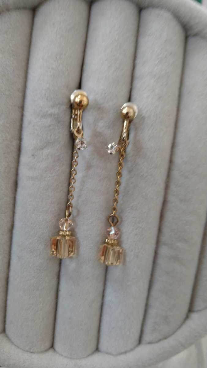 - □クリアピンク×多面カットベージュビーズ×ゴールドカラーチェーン×1粒ラインストーン・揺れるロングイヤリング□