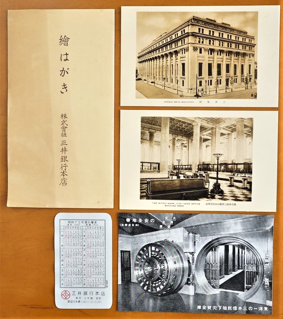 > 株式会社三井銀行本店 絵葉書 2枚 紙ケース付き + 地下大貸金庫チラシ1枚 + 昭和17年カレンダー1枚 検:三井本館 本店営業室 ノベルティ