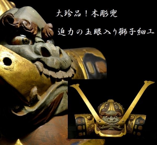 【 恵 #0491 】 大珍品!迫力の玉眼入りの獅子細工 木彫兜 金彩色 五月飾り