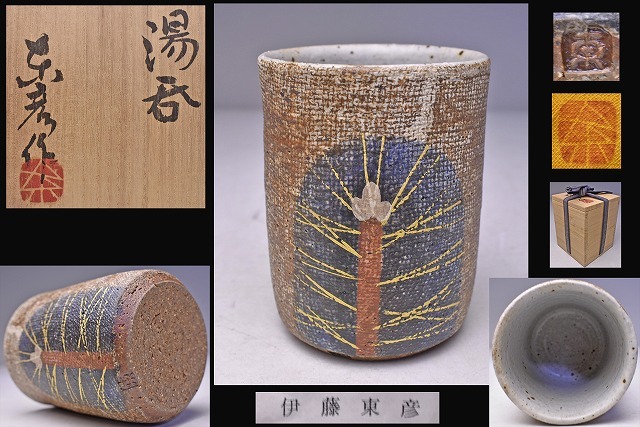 > 伊藤東彦 ★ 湯呑 ★ 共箱 ★ 松の文様 ★ 布目タイプ ★ 麦酒杯にも ★ ビア杯 ★ 笠間焼のベテラン ★
