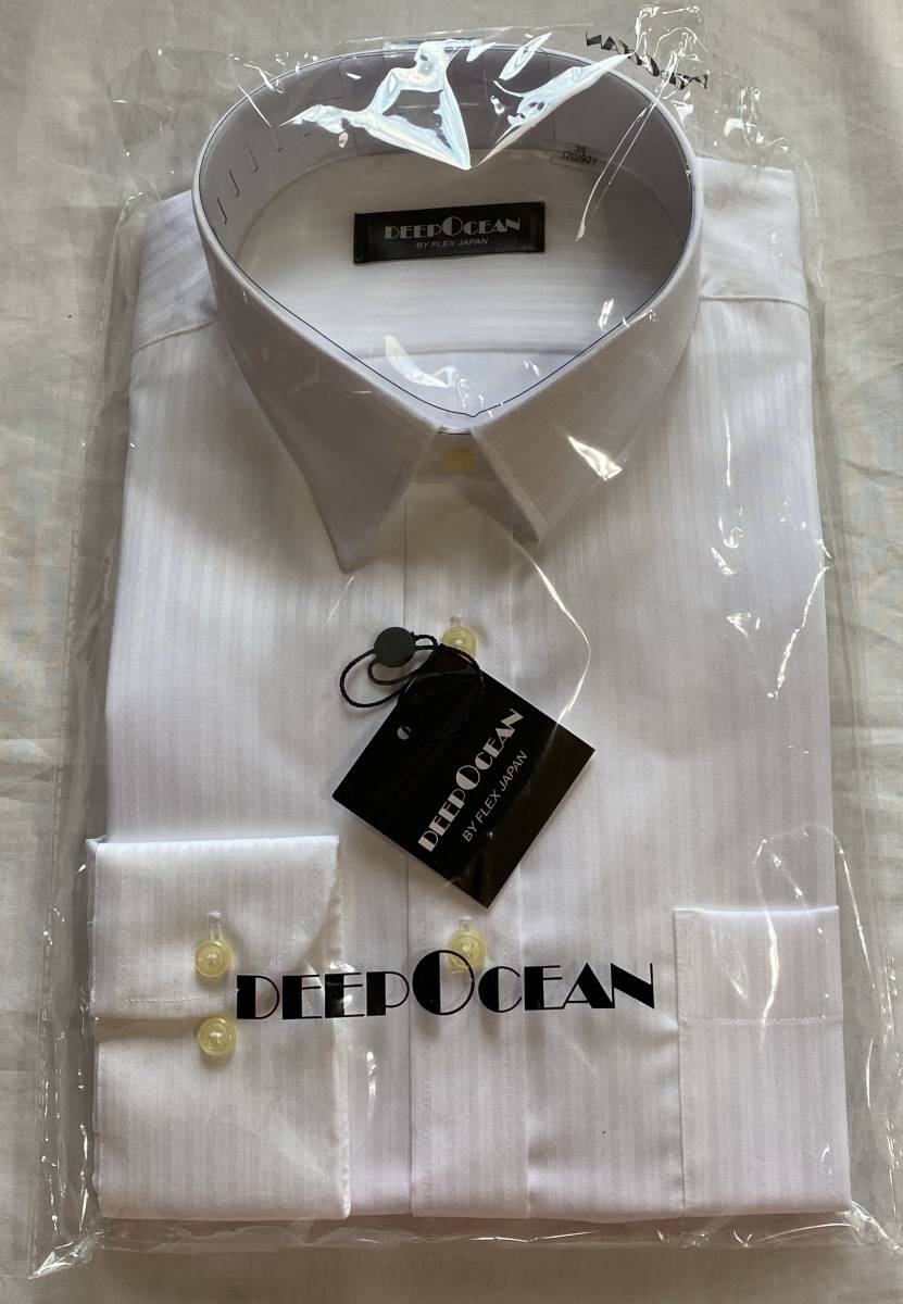 > 高級ワイシャツ Mサイズ 首39-裄丈82 フレックス社製 DEEP OCEAN 白地色に白縦ライン□□未使用品