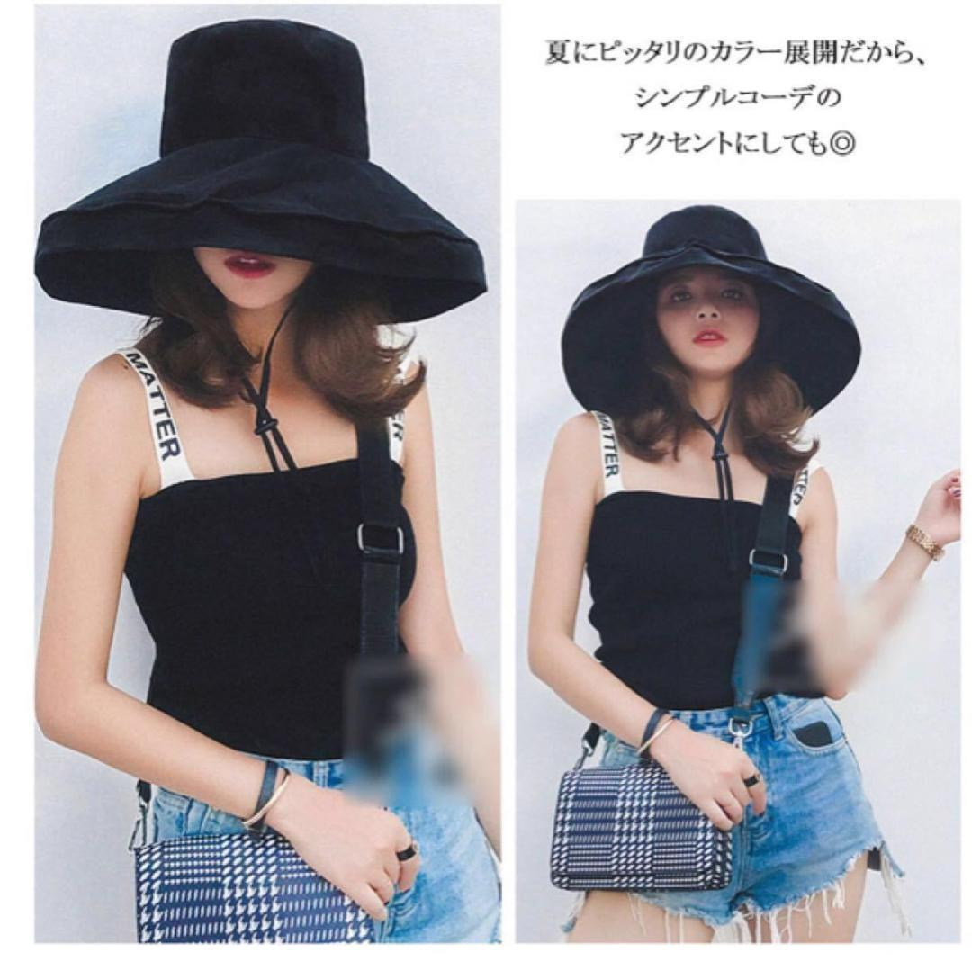 - つば広 帽子 UVケア ストローハット ブラック黒 小顔効果お洒落 UVカット
