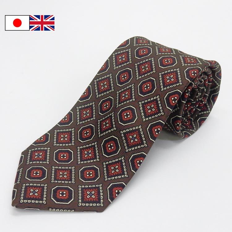 > 英国ADAMLEY(アダムリー)生地使用/京都産▼プリントネクタイ ブラウン×レッド 大柄小紋 シルク100% 日本縫製 KV-ADM03