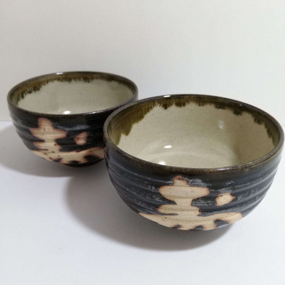> 益子焼 鉄釉抜絵 『寿』 汲出 ぐい呑み 2点セット 直径9.1cm×高さ5.8cm [益子 茶器 煎茶器 酒器 湯飲み茶碗]