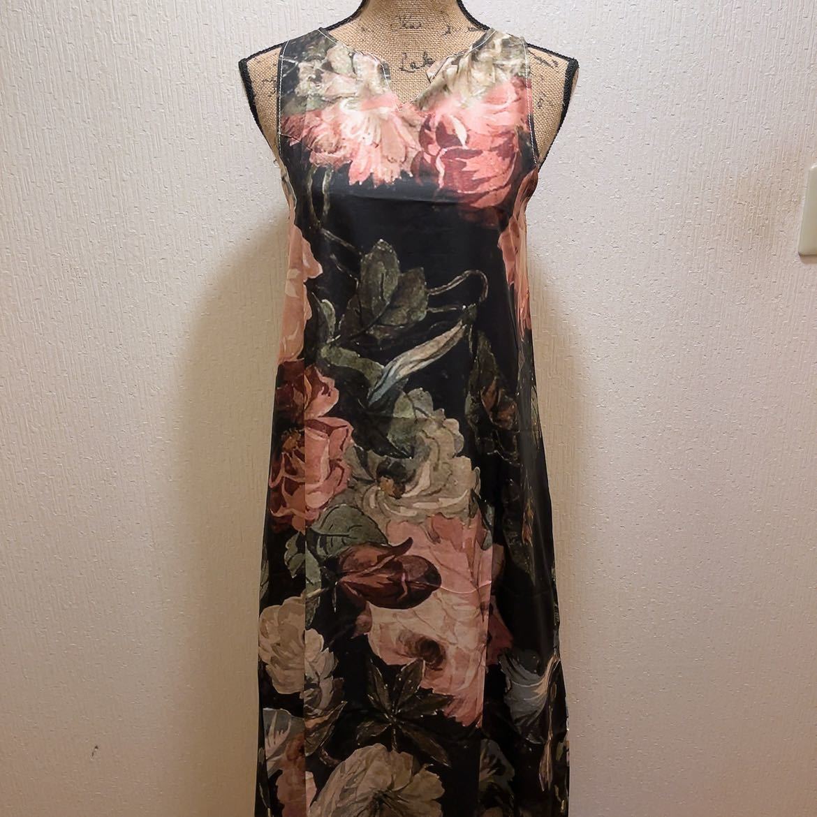 - 新品★ブラック地★ピンク花柄大人シックワンピース★総柄★ホームウエア★Mノースリーブワンピース