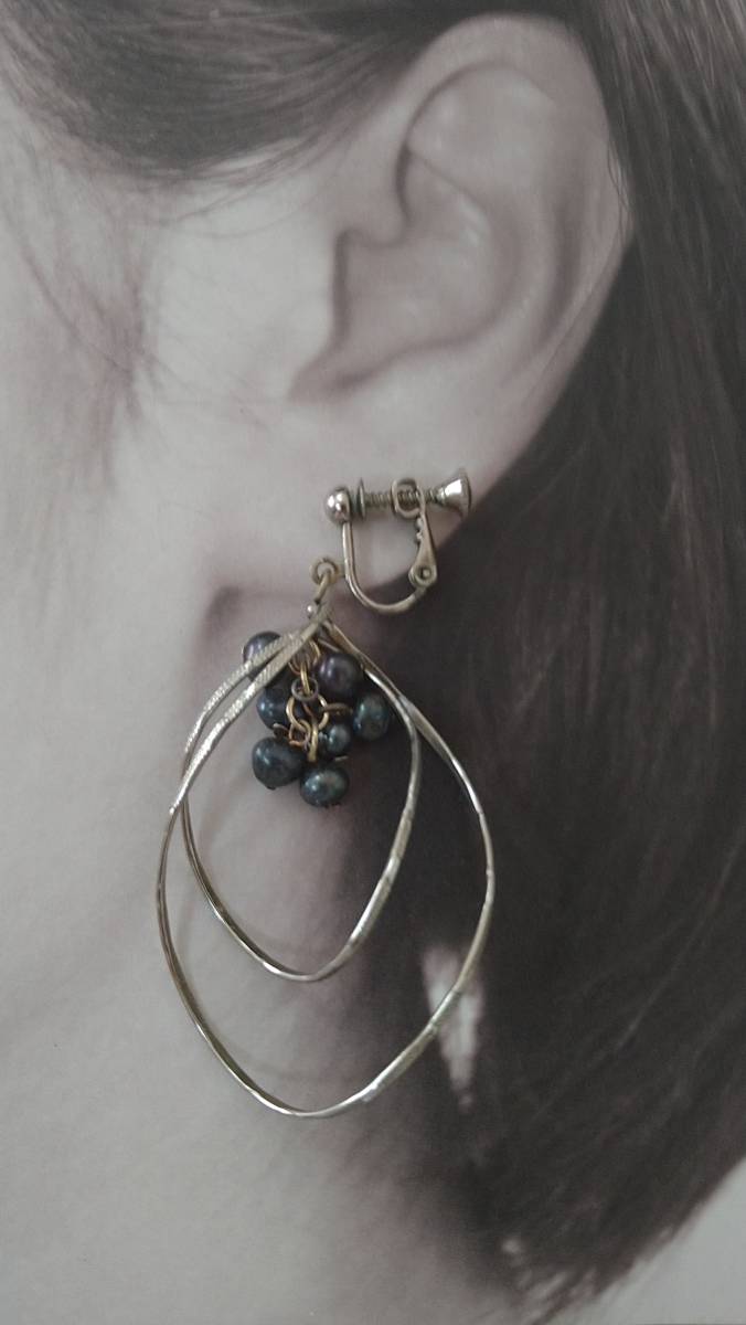 - しずく型シルバーカラー×紺色ビーズ 揺れるイヤリング