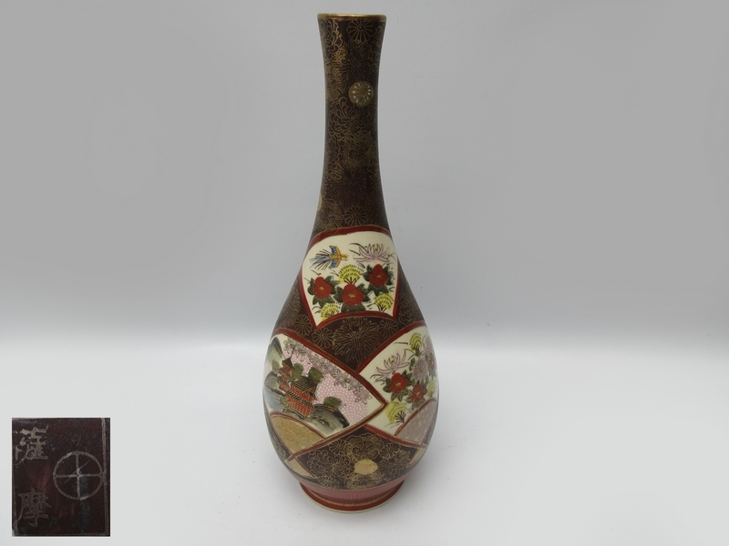 - ■ 薩摩焼 色絵金彩 鶴首 花瓶 [h約38㎝] ■ 花鳥 菊花 古都 伝統柄 №8778■