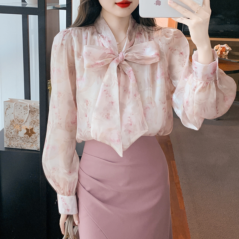 - 「同梱1万円送料無料」S~XLサイズ秋新品* レディースきれいめ*可愛い*花柄*総柄*リボン*ボウタイ*長袖ブラウスシャツ*ピンク