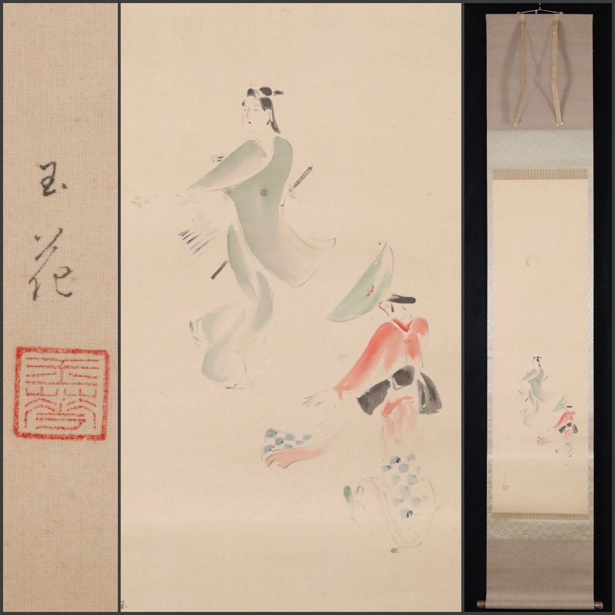> 【模写】吉】9062 渡辺玉花 月下踊り図 山内多門・吉村忠夫師事 大和絵 風俗画 美人図 茶掛け 茶道具 掛軸 掛け軸 骨董品